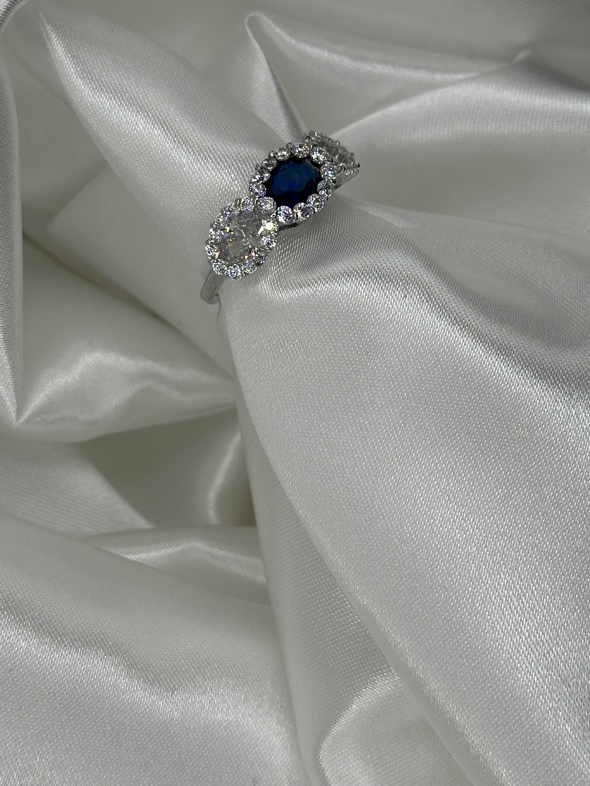 Anello in argento 925 trilogy bicolore, con zirconi bianchi naturali e pietra centrale blu